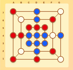 Take turns placing 12 pieces on the board. Form lines of three to capture opponent pieces.